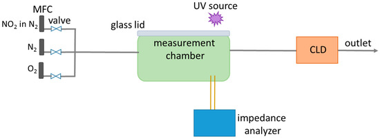 Scheme of the measurement setup with MFCs, measurement chamber, impedance analyzer, and CLD.
