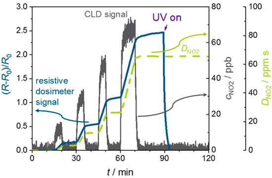Sensor signal (R − R0)/R0 of a 3% Al-doped ZnO, NO2 concentration cNO2 as obtained by CLD downstream of the test chamber, and NO2 dose DNO2 over time, calculated acc. to Equation (1) from the CLD data.