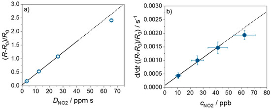 Calibration curves can be derived from Figure 4 and Figure 5. Figure 6a shows the sensor signal (R − R0)/R0 as it depends on the NO2 dose, DNO2. The data points and the standard deviations were determined as follows: In the time range when the sensor is not exposed to NO2 and the sensor signal remains constant, the mean value and the standard deviation of the dose and the sensor signal were calculated. The slopes, d((R − R0)/R0)/dDNO2, of the points in Figure 6a lead to the sensitivity of the dosimeter, whereas the slope of d(d/dt((R − R0)/R0)))/dcNO2 in Figure 6b is the sensitivity from the standpoint of a classical gas sensor. The points in Figure 6b correspond to the mean values and the standard deviation, determined from the concentration, measured by the CLD, and the slope of the sensor signal (R − R0)/R0 equal to the derivative d/dt((R − R0)/R0) observed during NO2 exposure. As can be seen in both cases, for low doses, the sensitivity remains constant, as indicated by the drawn regression lines and its dashed extension. For higher doses, here above approx. 40 ppm, the sensor begins to become non-linear, i.e., the sensitivity becomes smaller. This is preliminarily attributed to a shift of the adsorption/desorption equilibrium to the desorption side due to too many occupied sorption sites. Nevertheless, the concept to measure ppb-level concentrations of NO2 at room temperature using ZnO as the sensitive material and applying the concept of a resistive gas dosimeter with UV regeneration has been proven by these experiments.