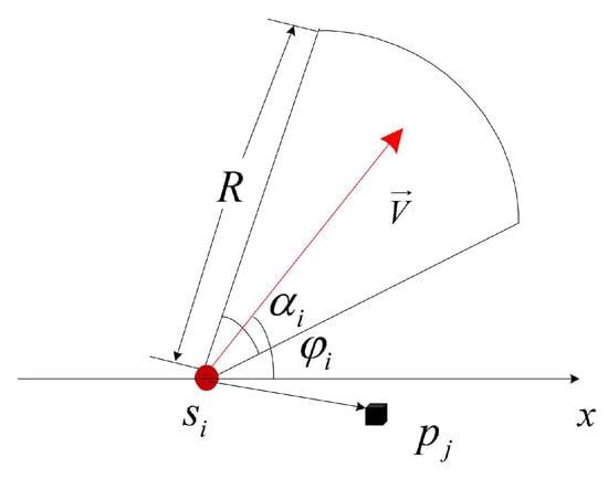 where is the coordinate of the sensor node, is the angle of view (AoV), and R is the sensing radius. In addition, is the working direction.