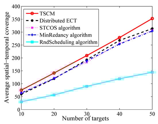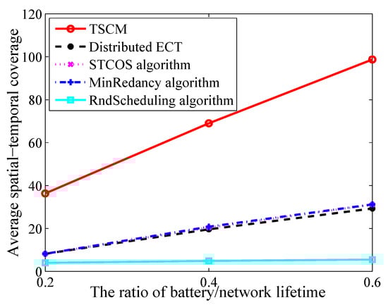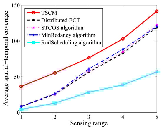 Then, we fix the number of sensor nodes and targets to 50 and 20 respectively, and the ratio of battery/network lifetime to 0.2. The simulation result displayed in Figure 6 shows that when the sensing range in the range of [1, 5], the TSCM can obtain 77.4%, 77.2%, 77.0%, 89% maximum increase and 39.3%, 37.4%, 35.9%, 70.2% average increase, respectively. Moreover, with the increase of sensing range, more targets can be covered, so increasing the sensing range of each sensor node is effective for maximizing the spatial-temporal coverage.