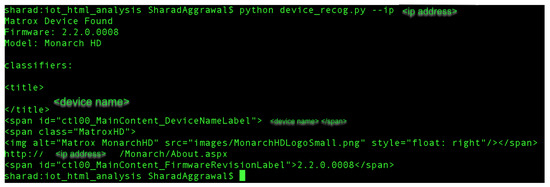 Figure 3 shows an overview of the Web-IoT Detection tool and explains the working of the tool to identify the IoT device. With the help of this tool, we were able to identify 233 physical IoT devices, which have a web interface. Figure 4 shows a sample working of the WID tool that takes an IP address as input and identifies the device, model, and firmware version. We also present the classifiers in the example, which are analyzed from different sub-URLs that the tool scraped.