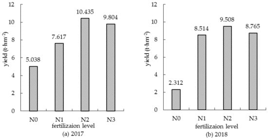 The yields of summer corn under different nitrogen fertilizer treatment are shown in Figure 2. The yield of summer corn increased with the increase of nitrogen fertilization. The maximum yield was 10.435 t/hm2 for 2017 and 9.508 t/hm2 for 2018 in the case of treatment N2. As the application rate of the nitrogen fertilizer was further improved, the yield was decreased, as in the case of N3 treatment. This demonstrates that rational fertilization promotes corn growth and ensures a high yield. Controlling surface source pollution caused by excessive fertilization, as can be seen, is conducive to sustainable and efficient agricultural production.