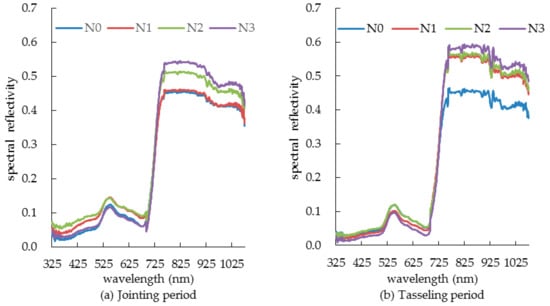 Under the same nitrogen treatments, during the growth process from jointing period to tasseling period, because summer corn was in the vigorous growth period, photosynthesis increased gradually with the increase of leaf area, and the coverage also increased, which effectively reduced the influence of soil background and other external factors, and the spectral reflectance of summer corn decreased gradually in the visible light band. From tasseling period to filling period, photosynthesis decreased gradually because of the decrease of chlorophyll concentration and the absorption capacity of blue and red light bands decreased; the spectral reflectance of summer corn canopy increased gradually. After entering the maturity period, the leaves withered yellow and the canopy spectral reflectance increased. While in the near infrared band, the canopy spectral reflectance increased gradually due to the jointing period and tasseling period belonging to the period of nutrient growth and accumulation under the control of internal structure of summer corn canopy. However, the filling period and maturity period are the reproductive growth period centered on grain, at the same time, the spectral reflectance of the canopy of summer corn was gradually decreased by the effect of the concentration of chlorophyll and the photosynthesis.