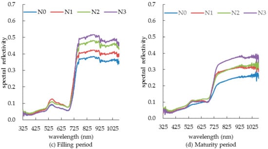 In the visible light band, the spectral reflectance of summer corn showed a clear difference under different nitrogen application levels, since chlorophyll plays a main role in the photosynthesis process and its concentration will have a direct influence on photosynthesis ability. However, the important component element of chlorophyll is nitrogen, so the SPAD value of high nitrogen application is larger than that of low nitrogen application [], which affects the photosynthesis. Therefore, the spectral reflectance of summer corn canopy decreased with the increase of nitrogen application amount, among which there was significant difference (p < 0.05), especially in the green light band during the filling period, as shown in Figure 3c. In the range of near infrared band, summer corn was controlled by the internal structure of plant canopy and the variation rule of the canopy spectral reflectance of summer corn showed an opposite trend under different nitrogen application levels. With the increase of nitrogen application, the spectral reflectance of canopy increased, and the difference between treatments was more significant than that of the visible light band, especially at the filling period, and reached a very significant level (p < 0.01).