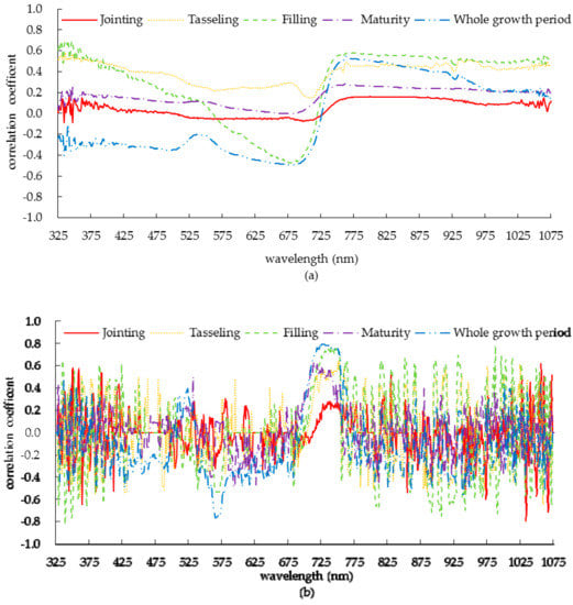 The correlation coefficient between the first derivative of the canopy spectral reflectance of summer corn and canopy nitrogen concentration is shown in Figure 4b. By comparing with Figure 4a, it can be seen that the correlation coefficient between the first derivative value and the nitrogen concentration in some bands was higher than that between the spectral reflectance and the nitrogen concentration, which was due to the removal of the influence of soil background on the spectral reflectance in the derivation process. It can be seen that in 700−750 nm band, there was a significant positive correlation in the whole growth period, among which the correlation of filling period and whole growth period were the highest, followed by tasseling period and maturity period, and the lowest correlation was at jointing period.
