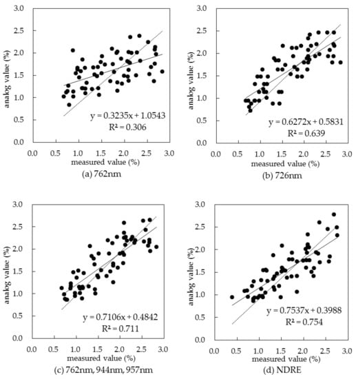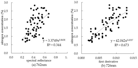 For the first derivative of spectral reflectance, except for the jointing period, the correlation between the first derivative of spectral reflectance and the nitrogen concentration was very significant. For the sensitive band of 726 nm in the whole growth period, the first derivative of spectral reflectance had the highest correlation with nitrogen concentration, and the correlation coefficient was as high as 0.795. The fitting model of canopy nitrogen concentration based on first derivative of spectral reflectance is shown in Figure 5b. Obviously, the use of spectral reflectance first derivative selection was more stable compared to the use of spectral reflectance to select sensitive bands.