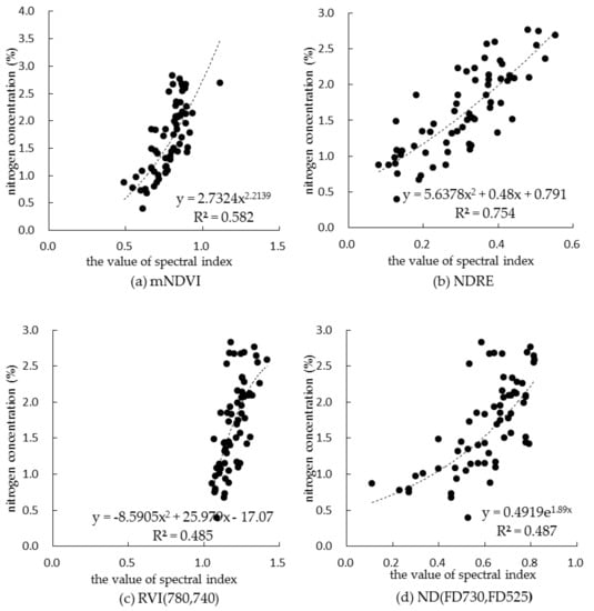 The spectral index of monitoring canopy nitrogen concentration in summer corn during the whole growth period was selected based on two-years data, and the spectral indexes of the top 20 correlation coefficients were screened out as shown in Table 5. In order to enhance the applicability of the spectral index in monitoring canopy nitrogen concentration in each growth period of summer corn, the correlation coefficient between 20 spectral indexes and canopy nitrogen concentration in each growth period was considered synthetically, and finally the top five spectral indexes were selected as shown in Table 6; these were mNDVI, NDRE, R780/R740, ND (FD730, FD525) and CCCI. The fitting model of canopy nitrogen concentration based on the top five spectral indexes is shown in Figure 6.