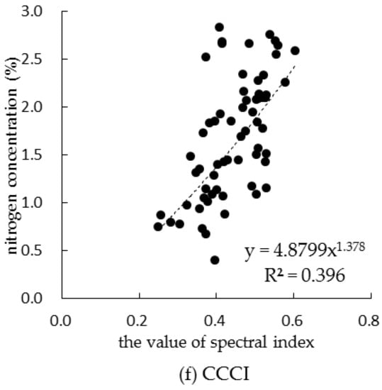 According to the above analysis results, the most sensitive band was selected according to the principle of maximizing the correlation value, and the optimal band combination was selected by stepwise regression analysis. The sensitive bands based on the synthesis of two-year data are listed in Table 2. For the sensitive band screened by spectral reflectance, it can be seen that the correlation between spectral reflectance of sensitive band and nitrogen concentration was not significant at the jointing and maturity periods. At tasseling and filling periods, the reflectance of the sensitive band was significantly correlated with nitrogen concentration, and there was a very significant correlation at filling period. During the whole growth period, the correlation between them was very significant at 762 nm; the fitting model of canopy nitrogen concentration based on spectral reflectance is shown in Figure 5a. The results showed that the spectral reflectance of summer corn was easily affected by soil background and leaf structure at jointing period maturity periods compared with tasseling and filling periods, so it was difficult to obtain an ideal sensitive band.