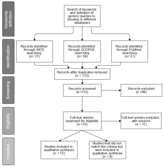 Figure 1 shows the search results. A total of 147 studies were found amongst the three databases (37 results from Web of Science, 59 from SCOPUS and 51 from PubMed). After removing duplicates, there were 133 studies left. During the first screening phase, 98 publications were discarded because they did not match the selection criteria. After that, the second screening phase took place. Although 20 studies did not fit the criteria, nine of them were included in the qualitative synthesis because they were considered relevant for the discussion and conclusions. A total of 15 studies met the inclusion criteria. These selected papers and the nine additional publications discussed are listed in Table 2 and Table 3, respectively.