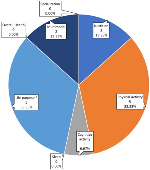 All the studies included in the review focused on one or two of the defined pillars. Studies on cognitive behavioral therapy (CBT) and habit management have been included in the “life purpose” pillar. As can be seen in Figure 2, the five studies focused on physical activity [,,,,] represent a third of the total, and the five focused on life purpose studies [,,,,] represent another third. Four of the studies related to the “life purpose” pillar [,,,] (80% of the “life purpose” pillar related studies and 26.66% of the total of studies) focus on habit management and CBT. Only two of the studies [,], which represent 13.33%, are multimodal. The study from Merriman et al. [] combined physical exercise and cognitive activity, whereas the one from Rodrigues et al. [] focused on nutrition and physical exercise. There are no studies focused on sleep, overall health, or socialization that otherwise fulfilled our filtering criteria.