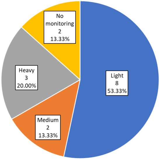 Figure 3 shows the classification of studies according to how they monitor subjects. Eight of the studies identified (53.33%) [,,,,,,,] employed light monitoring, based on questionnaires and tests to get data and parameters from users. Three of the studies [,,] (20%) employed heavy monitoring with controlled spaces or specific devices. Two studies [,] (13.33%) focused on medium monitoring, based on smartphones, wearables, and sensors. The remaining two studies [,] (13.33%) did not use any kind of monitoring systems, and relied instead on baseline and post-intervention assessments.