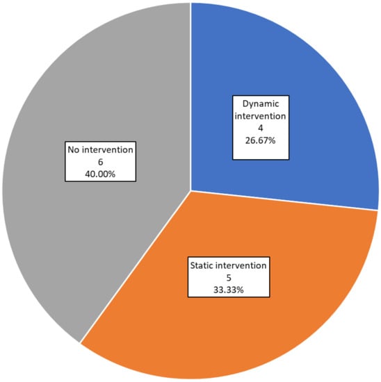 Figure 4 shows the distribution of studies according to the type of intervention. Six of the studies [,,,,,] (40%) did not carry out any kind of intervention. Static interventions were conducted in five of the studies [,,,,] (33.33%). The remaining four studies [,,,] (26.67%) report a dynamic automatized or semi-automatized guided intervention.