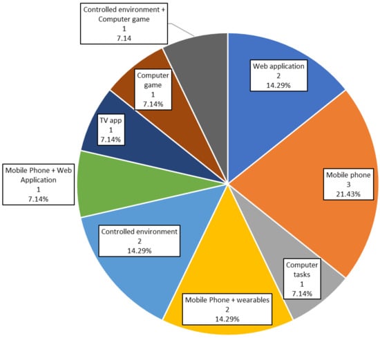 Web applications were used in three studies (21.43%). In two of them [,] (14.29%) web applications were the only technological solution employed, whereas in the other (7.14%) they were completed by mobile phones [].