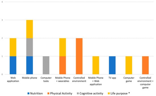 Figure 6 shows the distribution of studies according to each of the seven pillars hypothesized to support brain health. In fact, in the studies identified, only four pillars were monitored. Physical exercise was monitored via controlled environments in three studies [,,] and with mobile phone and wearable devices in one []. Nutrition monitoring and interventions are based on applications. We can find a mobile phone application in one study [], a web application in another [], and a smart TV application in a third []. Cognitive activity is measured with computer tasks in one study [], and with a mobile phone in another []. Finally, for monitoring of life purpose, in which we have included CBT and habits management studies, there has been the greatest number of different technological solutions tried: One of the studies used a web application [], another used mobile phones [], the third used mobile phones and wearable devices [], the fourth used a web application and a mobile phone application [], and the last one used a computer game [].