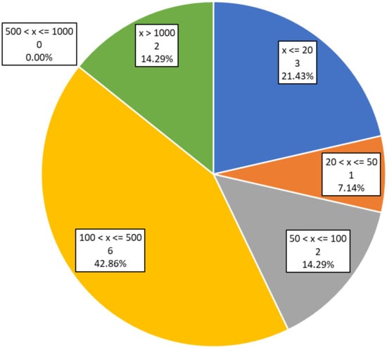 Figure 7 presents the sample size of subjects involved in validation for each study. Three studies [,,] (21.43%) report a sample lower or equal to 20 people.