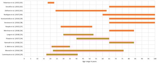 Figure 8 shows the distribution of studies according to the age of the validation cohorts. Six studies [,,,,,] (42.86%) were focused on elder people. Four studies [,,,] (28.57%) focused on middle-aged adults, and two studies [,] (14.29%) were focused on young participants. The study by Pavel et al. [] does not report the age group of its participants. The study by Mourad et al. [] and the study by Zielhorst et al. [] included a wide range of ages, but the latter excluded individuals older than 63 years.