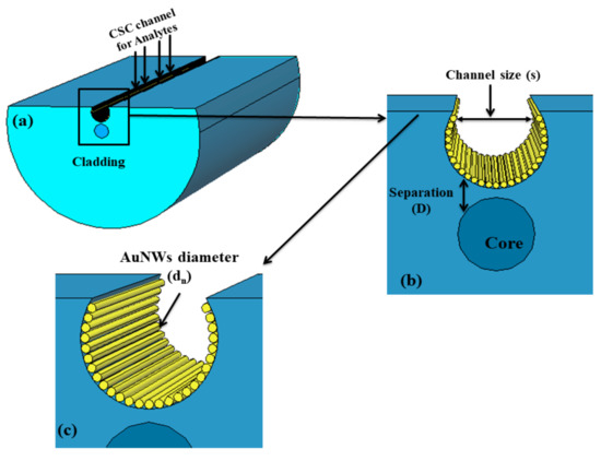Figure 1 illustrates the schematic cross-sectional view of the designed CSRIS. AuNWs are arranged along the length of the fiber inside the CSC. In order to maintain the symmetry of nanowires (NWs) on the boundary of CSC, the diameter of NWs is varied in natural numbers. The proposed sensor is designed by using a standard single-mode fiber with core/cladding diameter of 9/125 µm. The distance of CSC from the core, the diameter of the AuNWs and the size of the CSC are defined by D, dn, and s, respectively. The most versatile stack-and-draw method and lateral polishing technology can be used to fabricate the D shape fiber [17]. Later, the concave shaped can be fabricated on this D shape fiber by focusing the ultrashort pulse on the polished surface transversally. According to a previously reported article, a microchannel can be easily fabricated at the polished D shaped edge near the core of optical fiber by considering a Gaussian field distribution. The Gaussian field distribution is positioned at the edge of polished surface and part of the area exposed to the field is removed to form the sensing structure, as shown in Figure 1. The Gaussian field profile can be written in the form of the following equation [18]: