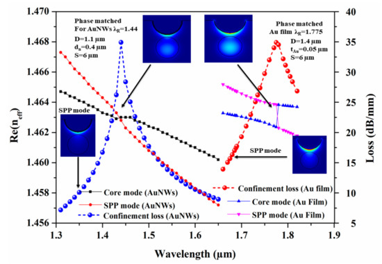 The proposed CSRIS is based on the LSPR phenomenon that takes place between the surface plasmon polaritons (SPP) and the core guided modes. It occurred due to the interaction of enhanced evanescent waves with target analytes of varying RI (na). These enhanced evanescent waves easily excite the conduction electron on Au film/NWs at a certain wavelength, which is known as the resonance wavelength (λR). At this λR, these conduction electrons of Au film and AuNWs generate the dielectric–metal interface guided plasmon waves. Figure 2 illustrates the dispersion curve of designed sensor for both Au NWs/film. The plot shows the variation of real effective refractive index (Re(neff)) of SPP and core guided modes at different wavelengths along with the modal loss spectra for both thin film and NWs. The plots are shown by blue and red circles for AuNWs and Au film, respectively. In the plot, the Re(neff) of highly dispersive SPP mode for both AuNWs and Au film, as shown by red circles and pink triangles, decrease linearly, while their core guided modes, shown by black squares and blue triangles, remain almost constant throughout the variation. Figures shown as insets are the electric field distribution for phase matched and SPP modes for both AuNWs and Au film when na = 1.33 with their optimized parameters. In the inset images, we can clearly see that in both cases (i.e., for Au NWs/film) the maximum portion of the light is confined in the fiber core. However, with increasing wavelength, most of the electromagnetic field extended into the cladding region and resulted in the reduction of Re(neff). The confinement loss for both Au NWs/film of the CSRIS can be calculated by the following equation [23]: