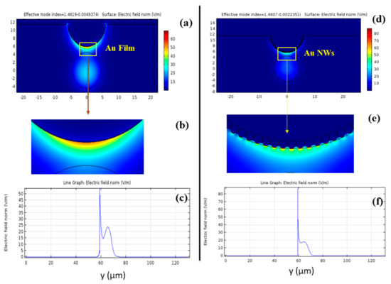 Figure 3b,e illustrate the magnified image of mode coupling of dielectric core guided mode with the SPP mode for Au film and AuNWs respectively. The moderate Ey field value in the core region is clearly visible, but a more localized Ey field around the Au film and AuNWs is also observed. To get a more intuitive view of the local plasma enhancement, we have shown the normalized field profiles Ey in Figure 3c,f for Au film and AuNWs respectively along y-axis. Here we can observe from both figures that the peak value for AuNWs is higher in comparison to Au film i.e., the normalized electric field strength for AuNWs is higher. Hence, it demonstrates that more energy from the dielectric core mode is coupled into the SPP modes of AuNWs, and therefore it can be more sensitive to the surrounding media than Au film.