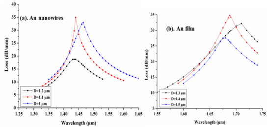 During the analyses, we have considered that light propagates along the Z-direction, while all the modal analysis is performed in the XY plane. The distance of the CSC from the core is of critical sensing performance, since it helps to determine the strength of evanescent waves and thus influence the coupling efficiency of SPP and core guided mode. Figure 4 illustrates the variation of modal loss spectra at different wavelengths for different D values. Figure 4a,b show the variation of spectral loss with respect to D, for Au nanowires and thin film, respectively. Here, for nanowires the separation of the CSC varied from D = 1 µm to 1.2 µm, and for the thin film, the separation is varied from D = 1.3 µm to 1.5 µm. Here, we can clearly observe the blue shift for AuNWs and Au film with maximum modal loss of 34.90 dB/mm and 34.76 dB/mm at D = 1.1 µm and 1.4 µm respectively. In both cases the higher loss for D = 1.1 µm and 1.4 µm may be attributed to the fact that, far from the core of optical fiber, the interaction region of field of the core guided mode with metal–dielectric interface is higher, due to the large value of the evanescent field. Hence, we have chosen these separations as the optimum distance of CSC from the core, for both Au nanowires and thin film.