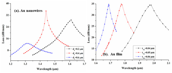 Figure 5 illustrates the variation in modal loss spectra at various nanowire diameters (dn) and film thicknesses (tAu) at optimized D. From Figure 5a,b we can clearly observe a blue shift in modal loss spectra at various wavelengths. We observe that the sensing response of the designed sensor is highly influenced by dn and tAu, and hence their optimization is an important factor for developing a highly sensitive sensor. Before the optimization of the dn and tAu, all other parameters are kept constant at their initial values. The nanowire diameter dn is varied at 0.2 µm, 0.4 µm, and 0.6 µm and achieved a maximum peak loss of 34.90 dB/mm at λR = 1.44, while in the case of Au film, a maximum modal loss of 34.87 dB/mm is obtained for tAu = 0.05 µm at λR = 1.775 µm. In both cases, due to the change in the diameter of nanowire and thickness of film, the effective refractive index (neff) of SPP mode varies, which leads to the spectral loss shift towards the blue wavelength.