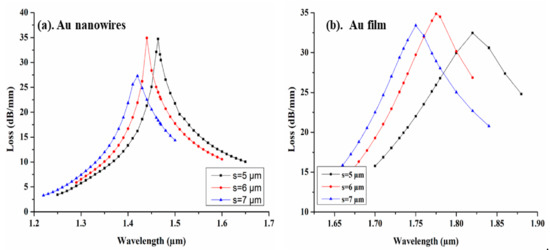 The CSC size (s) also plays an important role in the sensing performance of the proposed design. In order to investigate its influence on the performance of CSRIS, we keep the separation (D) of channel from the core at a fixed distance, while s is varied from 5 µm to 7 µm for both sensors covered with Au film and AuNWs. The modal loss spectra of the fundamental mode with the variation of s is depicted in Figure 6. From Figure 6, we can clearly observe a strong blue shift when the size of channel increases from 5 µm to 7 µm with a maximum modal loss of 34.90 dB/mm and 34.87 dB/mm for AuNWs and film respectively at s = 6 µm.