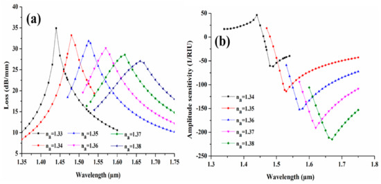 After optimization of all structural parameters, the designed CSRIS is characterized for a wide range of analytes of varying refractive indices. The variation in modal loss spectra for the CSRIS filled with AuNWs is depicted in Figure 7a. We can clearly observe a good red shift in loss spectra with respect to na varying from 1.33 to 1.38. Here, we can interpret that the full-width and half-maxima (FWHM) of loss peak broadens with increasing the RI of the analytes. The broadening of these loss peaks occurs due to the comparative lower index contrast because of increase of na. A minimum modal loss depth of 27.07 dB/mm is obtained for na = 1.38 and the maximum loss depth of 34.90 dB/mm is obtained at na = 1.33. For some specific wavelengths, the sensitivity of the designed sensor can be measured by using the amplitude modulation technique, which can be defined by the following equation [24]: