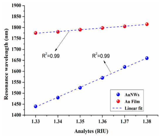 The performance of proposed CSRIS is investigated in terms of their wavelength sensitivity, amplitude sensitivity, and linearity. The relationship between resonance wavelength and corresponding analytes are shown in Figure 8, for both AuNWs and Au film. From the figure, we can clearly observe a good linearity of R2 = 0.99 for the na varying between 1.33 to 1.38. The wavelength sensitivity (Sλ) of the designed sensor can be calculated by the following equation [25]: