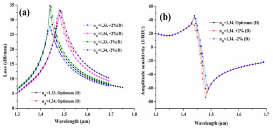 In general, it is very difficult to fabricate a sensor with such exact optimized parameters. Usually, a small variation of ±1% may take place during the fabrication process. To validate the sensing performance of the proposed sensor we have investigated the structural parameter with ±2% fabrication tolerance. Figure 9 exhibits the influence of the CSC separation (D) on modal loss spectra with the variation of ±2% from its optimum value. From Figure 9a, we can clearly observe that the modal loss decreases to 27.68 dB/mm and 34.41 dB/mm from its optimum value of 34.90 dB/mm, due to +2% and −2% variation in D, respectively, at the na = 1.33. Similarly, for na = 1.34, the loss decreases to 31.87 dB/mm and increases to 32.98 with +2% and −2% variation in D, respectively, for its optimum value of 33.23 dB/mm. Figure 9b illustrates the amplitude sensitivity corresponding to this variation and it can be clearly seen from the figure that the maximum amplitude sensitivity is increased by 6.95 RIU−1 and decreased by 6.58 RIU−1 due to ±2% variation of D.