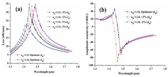 In addition, the ±2% in diameter (dn) of AuNWs are shown in Figure 10. From Figure 10a the decrease in loss to 23.01 dB/mm and 32.65 dB/mm is clearly observed with +2% and −2% variation at na = 1.33 from its optimum value of 34.90 dB/mm. The amplitude sensitivity is also drawn from the obtained spectral loss and shown in Figure 10b. From the figure, we can state that the amplitude sensitivity is increased by 23.23 RIU−1 and 4.08 RIU−1 with +2 and −2 % variation, while the optimum sensitivity is obtained of 66.70 RIU−1.