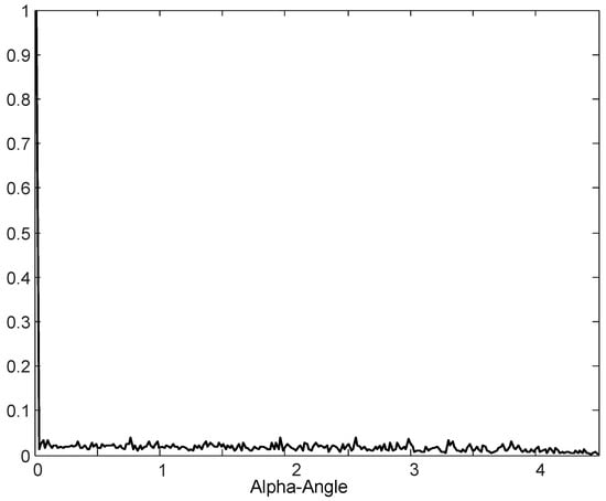 Spectral sensing based on the Cyclostationary or Angle-Time Cyclostationary analysis relies on the principle that the stationary noise has spectral line only for the cyclic frequency , as shown in Figure 1 [], which represents the alpha-angle profile calculated for a zero-mean Gaussian noise with unit variance. In the other hand, in the case of modulated signals, the alpha-angle profile always presents spectral lines for at least one value , which can be used for the sensing task.