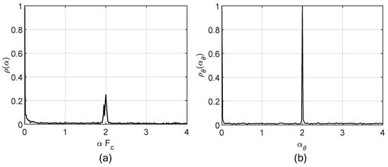 To illustrate such concepts, the calculation of the SCD and OFSC are presented in Figure 2a,b, respectively, for an amplitude modulation, double sideband full carrier (AM-DSB-FC) modulated signal with coherent nonlinear phase variation. In this case, the spectral lines of the alpha profile are attenuated, which would impair the detection of this signal during the spectrum sensing. On the other hand, these same spectral rays still exist in the alpha-angle profile, thus denoting the robustness of this metric in scenarios characterized by nonlinear phase over time.