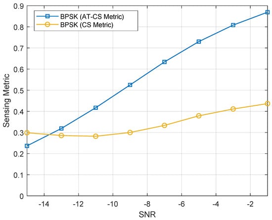 To investigate the behavior of the sensing metric, defined in Equation (19), according to the communication channel, simulation tests were carried out for an SNR range from −15 dB to 0 dB with steps of 1 dB. Besides, for comparison purposes, a reference curve was obtained considering the use of the alpha profile in calculating the sensing metric rather than the alpha-angle profile. The curves were plotted in Figure 3 considering a total of 300 simulations for each value of the SNR, from which the average values were calculated.