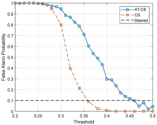 False alarm probability as a function of the detection threshold for the conventional cyclostationary and angle-time cyclostationarity.