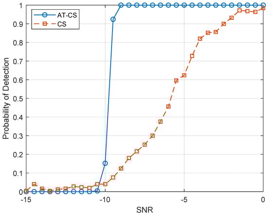 In Figure 4, the comparison thresholds and were chosen for the time cyclostationarity and angle-time cyclostationarity, respectively, while the performance of the sensing architectures was properly assessed in Figure 5. Each point of the curve in Figure 5 was obtained through 250 simulations, while the average detection rate was determined for each group. It is noted that the angle-time cyclostationarity presents superior performance, being this an expected result due to the behavior of the sensing metrics as a function of the SNR as presented in Figure 3. Once again, this technique proves to be robust when dealing with received signals whose phase variation is nonlinear.