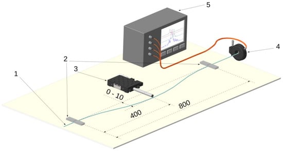 The experimental setup is shown in Figure 3. The sensor was mounted on the side supports located at a distance of L = 800 mm between each other. The supports fixed the rod in a straight position, while also allowing its longitudinal slip to minimize possible longitudinal deformations of the sensor during its bending process. At the edge, the rod was installed in a rotation mount, which provided the rotation of the rod around its axis to perform measurements at different positions of the cores relative to the direction of the bend. The bend was performed with the help of a micrometer screw located in the center of the sensor close to the section with Bragg gratings. The spectrum was measured by means of a MicronOptics SM125-200 four-channel Bragg interrogator.