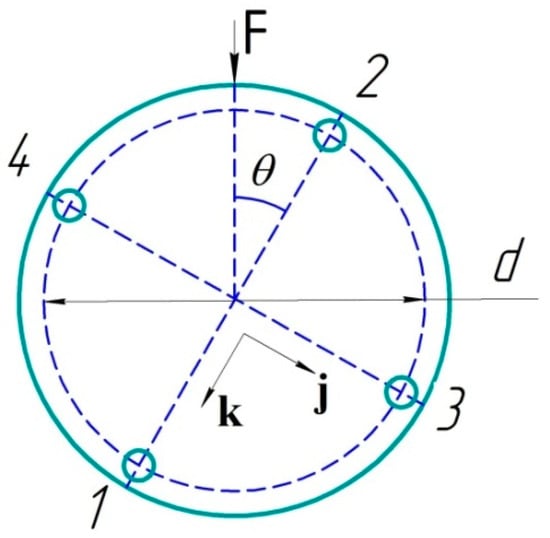 The cross-section of the sensor with four cores is schematically shown in Figure 4. Vector F indicates the direction of force applied onto the sensor. In our calculations, we used the angle θ between the vector F and the axis going through cores 2 and 1 in the sensor cross-section. The direction of this axis is determined by the unit vector k. The orthogonal axis going through the cores 4 and 3 is also denoted by the unit vector j. In our work, we conducted experiments for three different values of the angle θ.