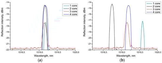 Figure 5 shows the initial spectra of the sensor for all four channels (a) and the spectra for its bend (b) with a curvature κ = 0.47 m−1 (transverse deformation a = 10 mm) and the angle of influence θ of approximately −2°. We determined the Bragg wavelength through the standard software of the interrogator without averaging the data.