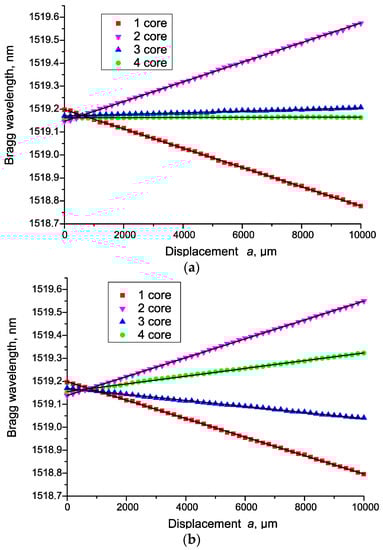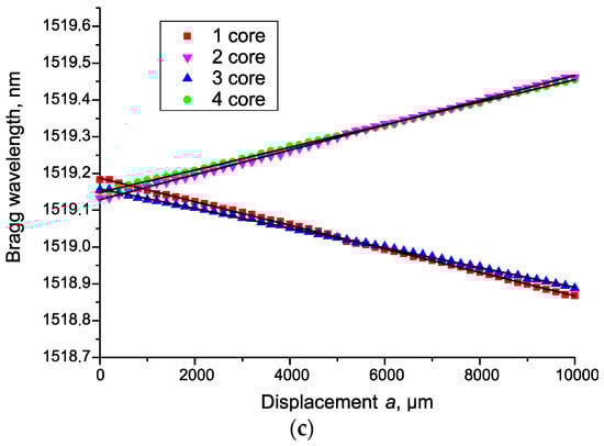 The results of the experiments are shown in Figure 6, in the form of dependences of the change in the sensors’ Bragg wavelengths on the magnitude of the linear influence a. At a small angle θ, the magnitude of the resulting deformation can be calculated by Formula (2) or (1), considering the sensitivity being equal to 1.1 pm/με. Such influence is obviously a special case of the influence along an arbitrary axis. In general, the magnitude and direction of the deformation, namely the curvature κ for a four-core sensor, can be calculated by the general Formula (7):