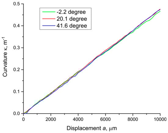 Applying expression (7) to the experiment’s results, we calculated the value of the curvature κ at the point of force application for each experiment. The results for three different angles θ are presented in Figure 7. The figure below shows that the calculation of the curvature at different angles of force application θ does not lead to any systematic errors. As a result, the dependence of the calculated curvature on the magnitude of the linear transverse influence a at different angles is almost the same.
