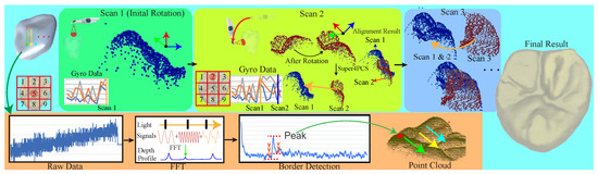 There are various digital reconstruction methods. Optical reconstruction [1,2,3,4] uses cameras to capture visible light reflected from objects for reconstruction. Additionally, there are also light detection and ranging (LIDAR)systems [5,6,7], which actively emit laser rays and reconstruct objects by stereoscopic matching or reflected time measurement. However, gums occlude part of teeth to limit their reconstruction ability. Furthermore, teeth having complex scattering properties make reconstruction more difficult. In order for volumetric reconstruction, computed tomography (CT) [8,9] uses X rays to penetrate human tissues and to measure the absorption ratio, and magnetic resonance imaging (MRI) [10] uses various magnetic resonances to locate various tissues. However, because they target the whole torso and a tooth only occupies a small portion, the reconstruction may not have enough information for precision. Moreover, they are too noxious for periodic inspection and frequent reconstruction. Optical coherence tomography (OCT) [11,12] can harmlessly penetrate gums using low-coherence infrared rays, but the process easily induces disturbances in its frequency-based reflections resulted in noisy capturing. There are OCT-based dental research for manually inspecting under-gum dental structures [13,14] and periodontal inspection [15,16,17]. However, they do not aim at reconstructing the dental surface and requires manual inspection and examination. To the best of our knowledge, there is still no work applying the technology for dental reconstruction to possibly relieving the time-consuming and painful mode-taking process and to open the possibility for computer-assisted inspection and examination. Additionally, a patient’s mouth has limited operation space for an injector with a small caliber and a short penetration depth and operation range to cover the entire tooth with a single scan. In other words, reconstruction requires multiple scans for the target region. We relieve its noisy nature with a series of processing stages including optical rectification, frequency-to-depth-density transformation, volumetric boundary detection, and surface reconstruction. Additionally, there are flat regions, such as the mesial side of front teeth, to reduce tracking robustness. We enhance aligning robustness by ensuring a proper initial orientation and enough features in the following two manners. First, we design a scanning order for different types of teeth in order to start from a feature-abundant region; second, we have a 3-axis gyro to track the scanning posture in order to have a better initial orientation for alignment. Furthermore, it is important to immediately examine the alignment results to enhance the scanning success rate. Thus, we accelerate the computation with Graphics Processing Units (GPUs) and streamline the data transfer and computations to have an interactive OCT-based dental scanning framework.