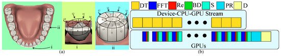 (a) This illustrates our two designed scanning orders based on the size of its occlusal surface where the left shows the location and viewing direction of two representative teeth; the middle is for the one of a small occlusal surface, and the right is for the one of a large surface. (b) There are two parallel streams: data transfer and GPU computation. While transferring a slice of scanning data (DT), GPUs also compute fast Fourier transform (FFT), optical rectification (Re), and boundary detection (BD). At the end of scanning, GPUs finalize the last slice, do the alignment, and show the stitched point cloud.Effective and robust scanning ordering