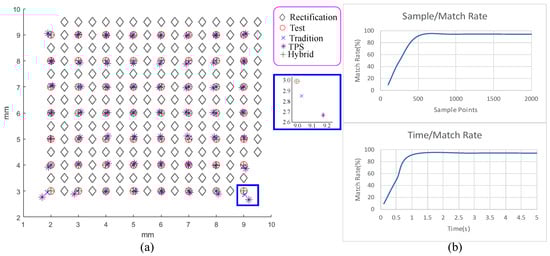 (a) This shows the rectification results of traditional radial and tangential distortion removal (blue crosses), thin-plate spline (TPS) interpolation (purple stars), hybrid of both (green pluses), and ground truth (red circles). Their averaging errors are as , , and mm, and their maximal deviations are , , and mm. (b) This shows the relation between the alignment success rate and the number of samples (top) and computation time (bottom).Rectification analysis
