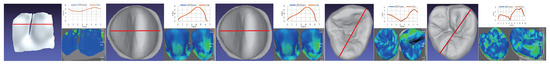 This illustrates the precision analysis when using the model constructed by the state-of-art digital intraoral scanner Carestream’s CS 3600 [4] as ground truth for the living incisor and the isolated incisor, premolar, and molar teeth, where the average deviations are 8.71, , , and m, respectively, and the maximal are , 263, 135, and 235 m, respectively. The left shows the reconstruction surface; the right top shows the visualization of height differences at the cutting line, where blue marks the results reconstructed by the state-of-art, and red marks those by ours; and the right bottom visualizes the reconstruction errors while comparing to the model generated by the state-of-art using the rainbow coloring scheme.Precision comparison