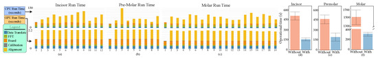 (a–c) The run time of each stage at various scans using a CPU (the top) and a GPU (the bottom) for the incisor, premolar, and molar teeth and (d–f) the statistics of our user study in the time of operation in the unit of seconds with/without using the visualization system.Run time analysis