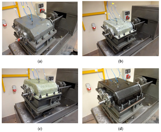 View of housings mounted on the stand together with measuring transducers [59]: (a) Steel housing; (b) K_1 housing; (c) K_2 housing; (d) K_3 housing.