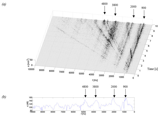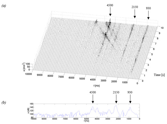 Identification of the resonant structure and vibroactivity during the coasting test of the K_3 housing made of a carbon fiber reinforced composite showed that the resonance of the housing occurred at frequencies of approximately 0.9, 2.0, 3.8 and 4.8 kHz (Figure 7). In the time-frequency distributions, lines of signal amplitude growth can be observed. They were caused by significant energy contained in characteristic frequencies of the meshing and their harmonics. The most qualitatively significant increase in the amplitude is observed when the meshing frequency meets the resonant frequency of circa 0.9 kHz.