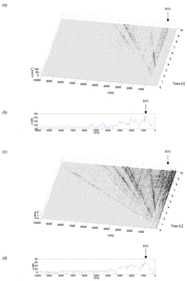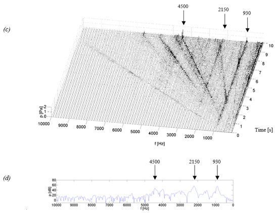 Time-frequency distributions of vibration signals and acoustic pressure—Figure 5a,c and Figure 6a,c—have confirmed the modal analysis results for the selected measuring point—Figure 5b,d and Figure 6b,d—where the occurrence of resonant frequencies is also observed in the lower range of frequencies.