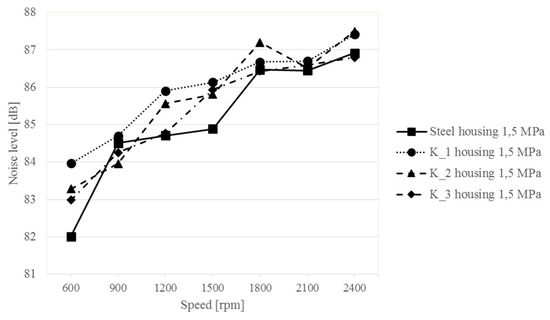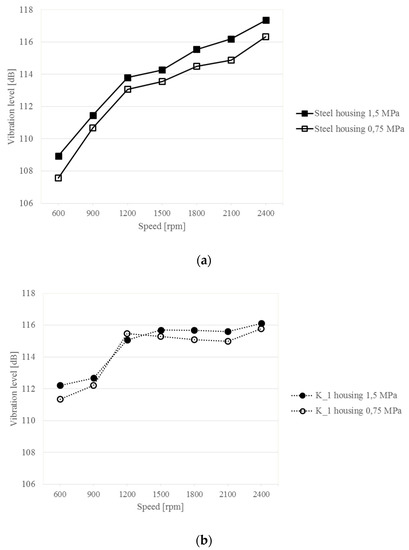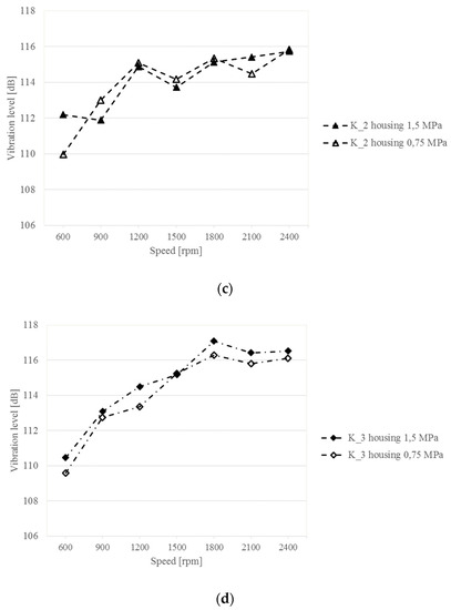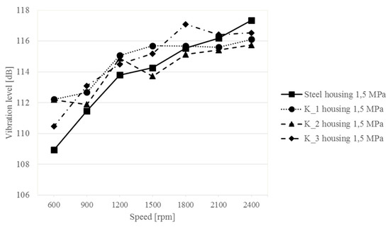 Further in this chapter, a study on the comparison of sensitivity of the Steel housings and the composite housings K_1–K_3 to a change in the load and rotational speed of the gearbox is presented. The obtained vibration levels of each of the tested housings were compared, depending on the gearbox rotational speed and two loads, 1.5 and 0.75 MPa. The results of these tests are shown in Figure 11.